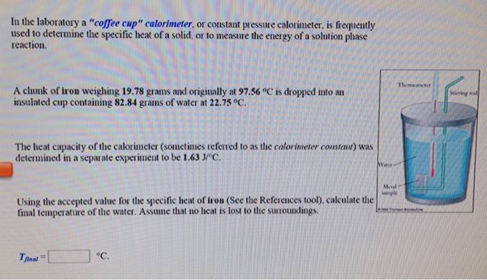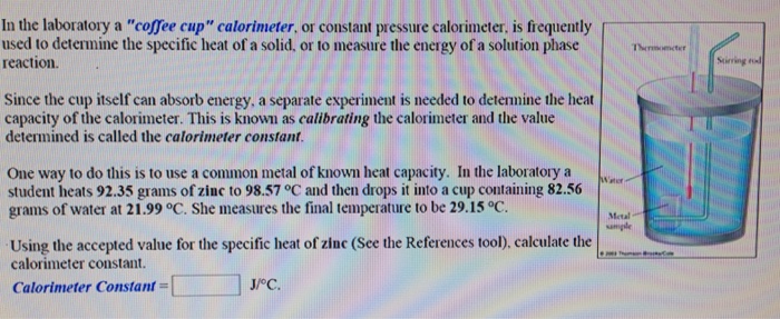 Chapter 09 - 16 - Constant Pressure Calorimetry (coffee ... from i.ytimg.com The change in the mass of the iron wire is used to calculate de iron. You can determine the constant by this formula: For measurement of the calorimeter constant, the energy of combustion of methyl salicylate is 5902 ± 1 cal/g (24720 j/g); (no correction for pv work needs to be done.) multiply this by the mass of methyl salicylate you used to find de sample. Explanation of calorimeter constant (bomb heat capacity) and an example how to calculate it. A calorimeter constant (denoted c cal) is a constant that quantifies the heat capacity of a calorimeter. Do not count the mass of any spherical nodules; In si units, the calorimeter constant is then calculated by dividing the change in enthalpy (δh) in joules by the change in temperature (δt) in kelvins.